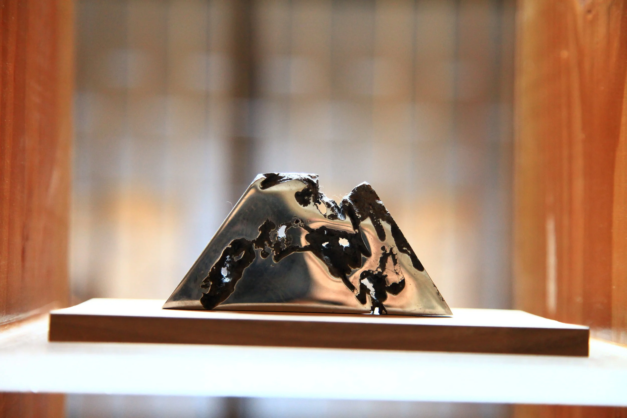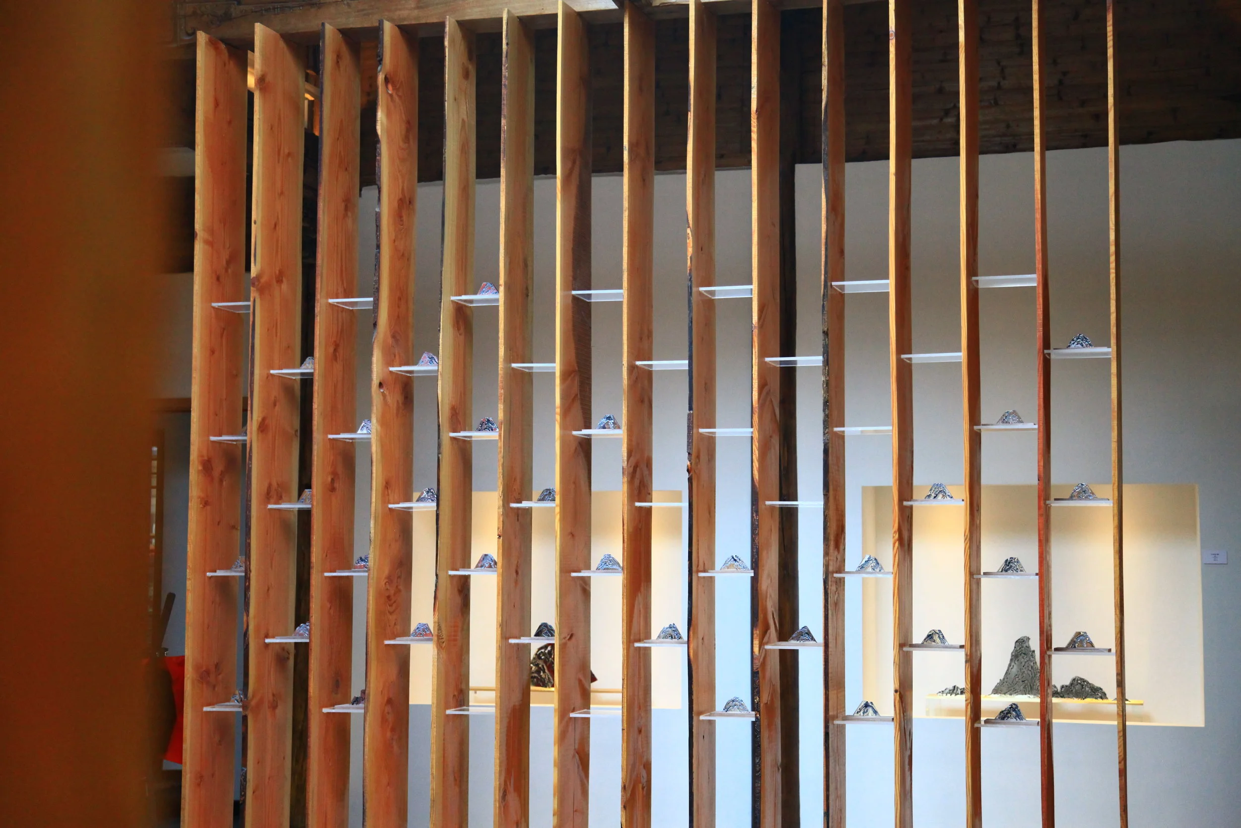 “Harmonic Collaboration” was an artistic collaboration between American visual artist and filmmaker Bill Claps and Chinese sculptor Lin Gang, where they encouraged each other to create works of art inspired by the other artist’s oeuvre. Gang created abstract mountain sculptures inspired by Claps’ Sacred Mountains series, and Claps created mixed media artworks utilizing Tang era nature poetry translated into Morse code, a nod to Gang’s Tang era inspired sculptures. 策展人端木雅莉