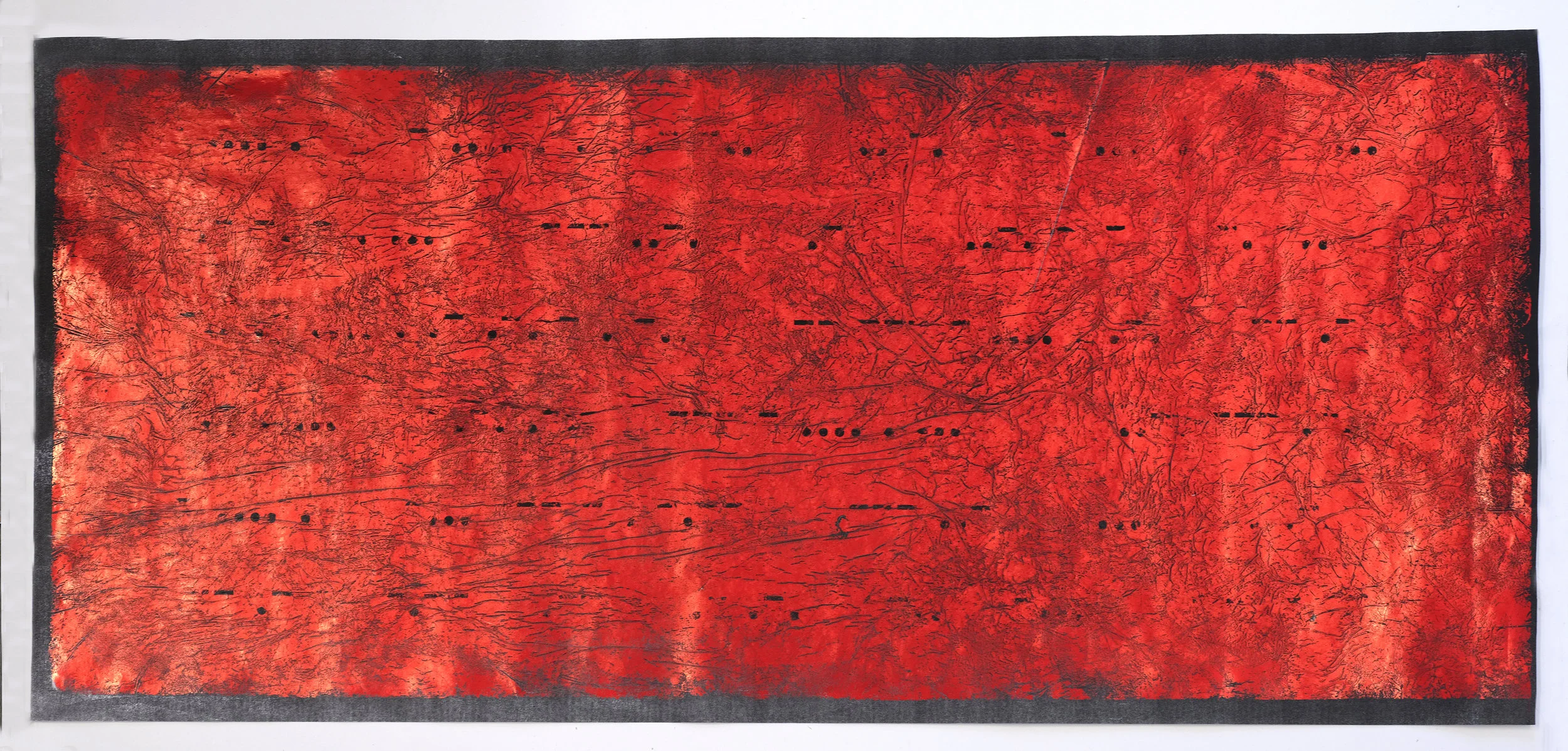 For this exhibition, Bill Claps created abstracted mixed media artworks that use fragments of classical Chinese poetry, translated into Morse code, as their source material. The Morse symbols move through the works with the musicality and cadence of musical notes. The highly textural artworks incorporate printing, painting and digital technology to provide a contemporary interpretation of classical Chinese landscape painting.