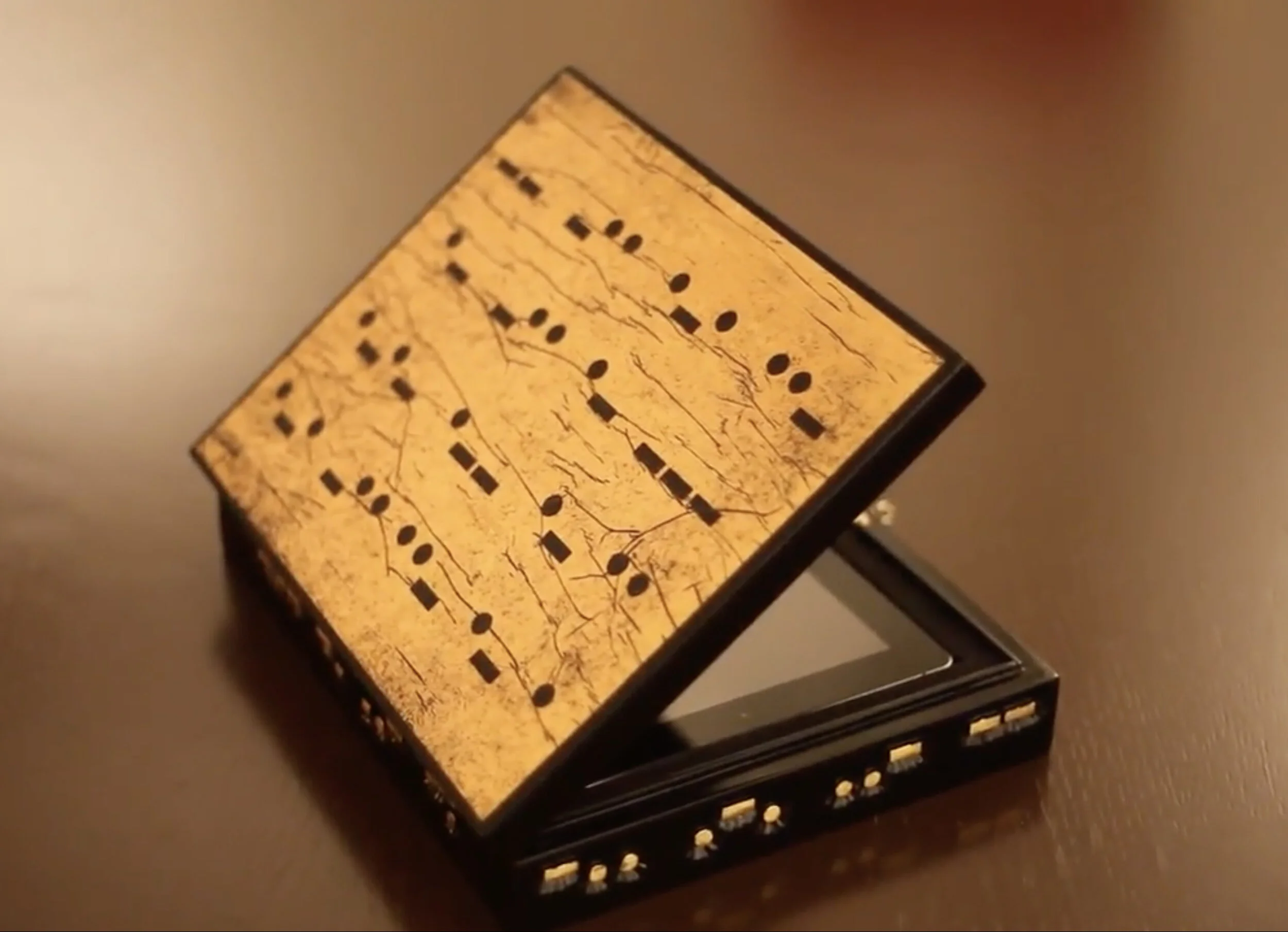 A view of the video box/art object that contains the video "Enduring Conundrum", which is played on an iPad. The box was a collaboration between Bill Claps and Umberto Cervo, a master woodcarver in Napoli, Italy. The project was sponsored by Made in Cloister Foundation of Napoli, Italy.
