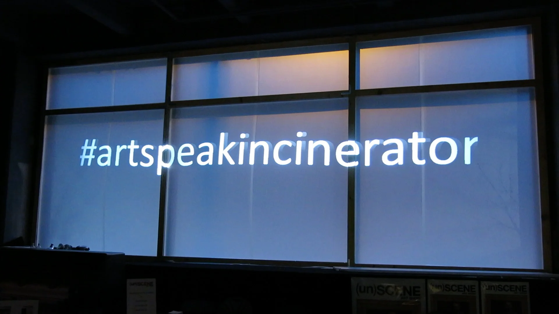 The “Artspeak Incinerator” installation investigates the use of language in contemporary art journalism and critique, interrogating and digitally incinerating the art world’s coded language, releasing it into the atmosphere in an altered and purified state. Throughout Armory Arts Week Claps will be sourcing examples of artspeak from various art fairs, art publications, and institutions throughout New York City, utilizing a technology interface to translate that language into Morse code, and projecting and digitally incinerating the output on the facade of the (un)SCENE show building and other art institutions throughout the city. The project utilizes Twitter and croudsourcing to generate content. To incinerate particularly egregious artspeak, tweet the text using the hashtag #artspeakincinerator. This prompts the language to be instantly projected onto the facade of the show building, translated, and then digitally incinerated up the side of a metaphorical chimney.